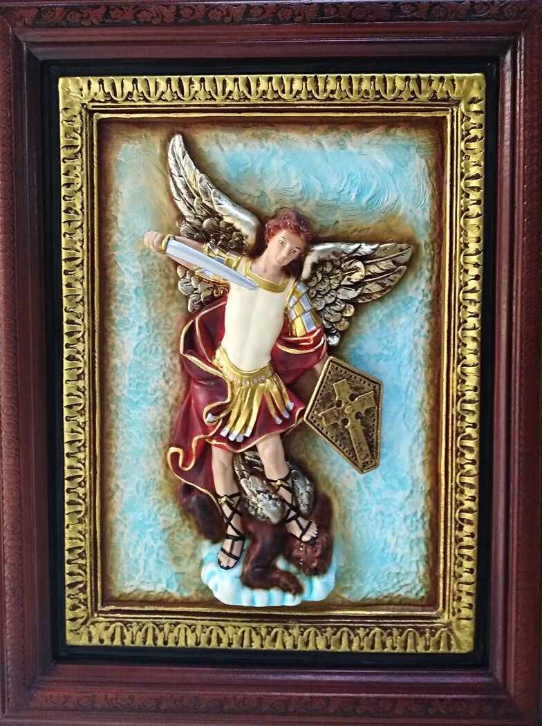 Cuadro del arcángel san miguel en fibra de vidrio, con marco en madera y pintado al oleo.